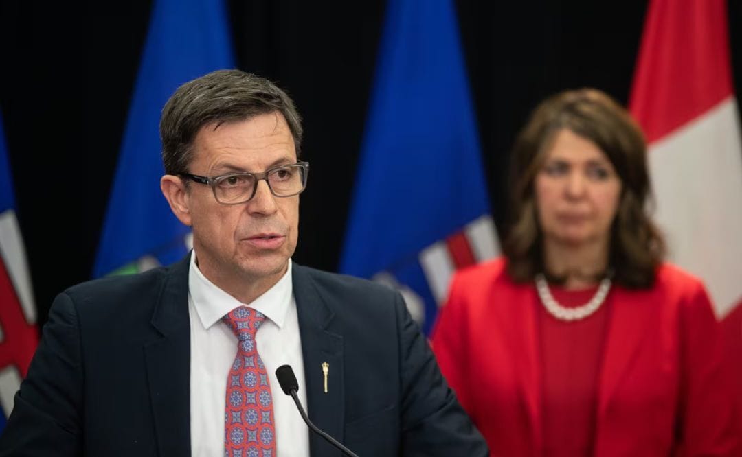Alberta Minister of Forestry and Parks Todd Loewen with Premiere Danielle Smith in the background | THE CANADIAN PRESS/Jason Franson