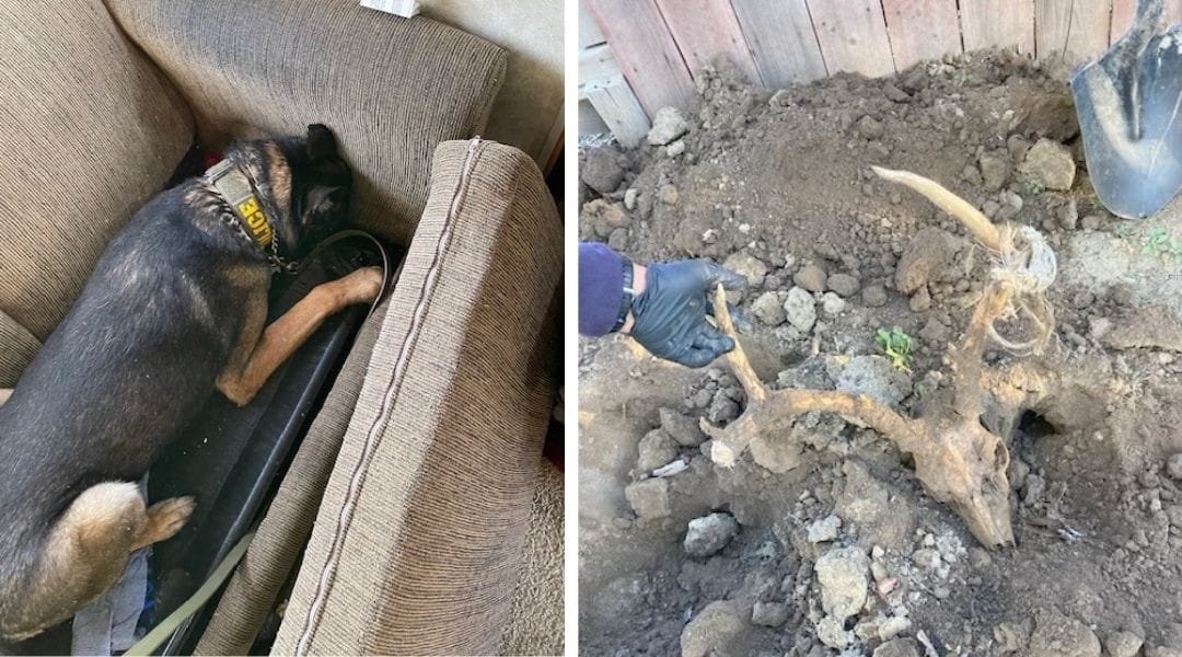 During the searches, officers seized numerous deer skulls, processed venison, and other evidence. A firearm without a serial number (read: a ghost gun) was recovered, and CDFW K-9 units did their thing as one dog alerted to a concealed firearm hidden under a couch, while another located a buried deer head.