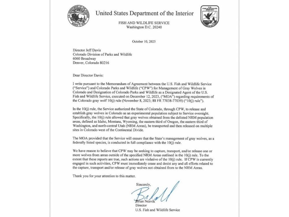 With no compliant wolf sources left, new releases are stalled, threatening to kneecap Colorado’s program. As of right now, CPW has not formally replied but insists on full compliance with federal and state laws.